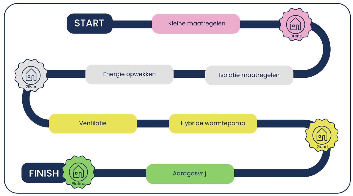 Voor elk type woning maken we samen met woningeigenaren een energiebespaarroute. Hierop staan de maatregelen die nodig zijn om de woning op een duurzame manier te verwarmen. Elke energiebespaarroute volgt enkele stappen. Eerst zetten we in op isolatie zodat minder warmte nodig is. De laatste stap is de overstap naar een duurzame warmtebron.