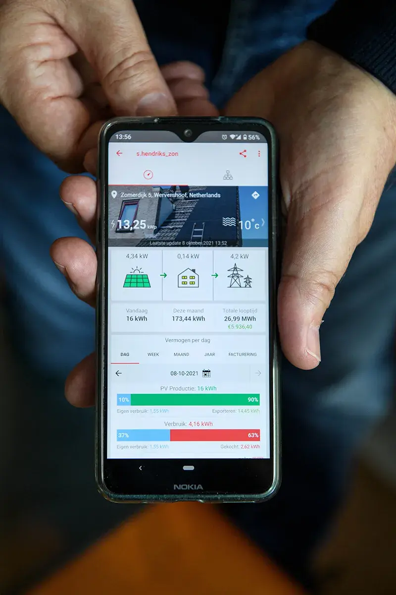 Bekijk wat je zelf kan doen‘Het voordeel van zonnepanelen op meerdere dakvlakken, is dat de productie van energie de hele dag doorgaat. Als in de toekomst de salderingsregeling stopt, wordt dat pas echt interessant. Als je dan optimaal wilt profiteren van zonne-energie, is het belangrijk dat je de hele dag door energie produceert. Op mijn telefoon heb ik een app waarmee ik precies kan zien hoeveel energie ik opwek. De app geeft ook een percentage van 56 procent aan. Dat betekent dat 56 procent van de energie wordt gebruikt op het moment dat het wordt opgewekt. Ik vind het een uitdaging om dit percentage zo hoog mogelijk te krijgen.’