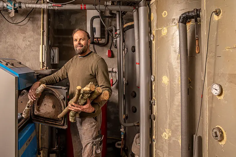 Voor het verwarmen van de woning heeft Johan gekozen voor een houtvergasser. “Die moet je vooral niet verwarren met een traditionele houtkachel. Een houtvergasser heeft een zeer hoog rendement en een zeer geringe uitstoot van belastende stoffen. De ketel van een houtvergasser functioneert op basis van het houtvergassingsprincipe. Je stookt in het bovenste compartiment dat op druk wordt gebracht waardoor de vlam naar het onderste compartiment wordt gestuwd. Daar wordt extra lucht toegevoegd en dan vindt de feitelijke verbranding plaats. Er komen houtgassen vrij die volledig verbranden in een verbrandingstunnel. Deze vorm van verbranding is helemaal schoon en levert een rendement van nagenoeg honderd procent. Met de warmte die vrijkomt verwarmen we water dat we opslaan in een buffer-ketel met een capaciteit van 3.500 liter. Het is wel belangrijk dat je goed gedroogd hout gebruikt. Dat halen we uit ons eigen stuk bos waarna we het een jaar of drie laten liggen. Daarbij is het goed om te weten dat bij het rottingsproces van los hout in het bos meer CO2 vrij komt dan bij verbranding met een houtvergasser.”